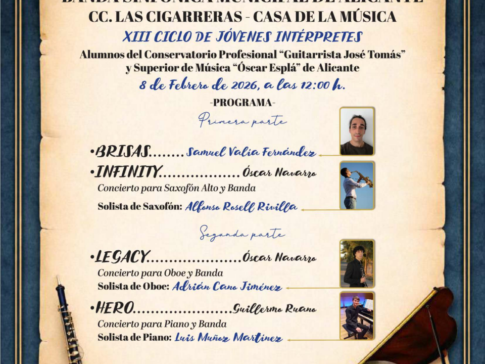 Banda Sinfónica Municipal. XIII Ciclo de Jóvenes Interpretes Alumnos del Conservatorio José Tomás y Óscar Esplá Casa de la Música de Las Cigarreras 8 de febrero de 2026 a las 12:00h Gratuito […]