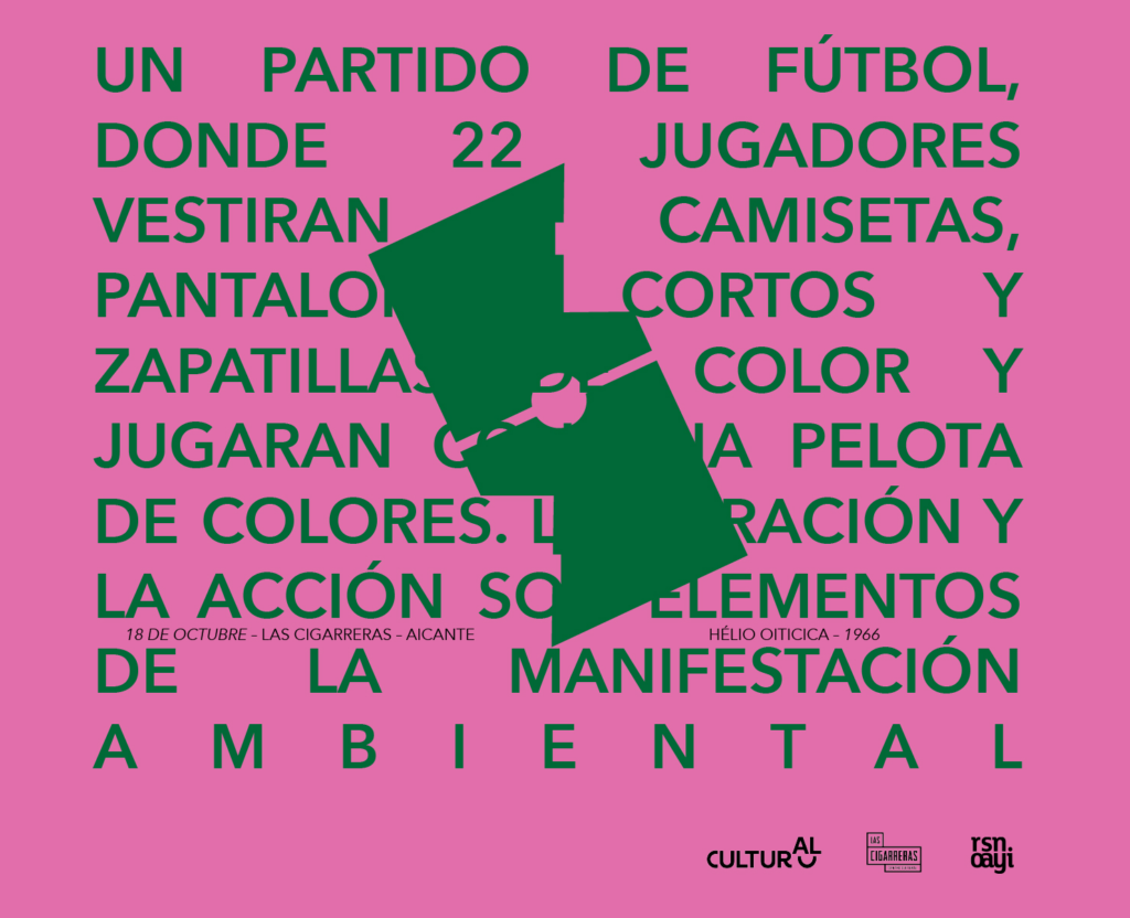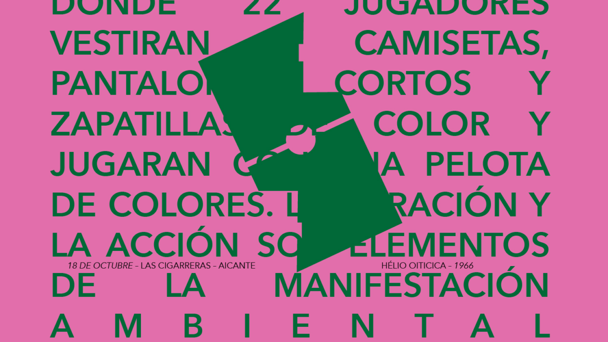 Esta actividad se plantea a partir de una nota que dejó escrita el artista Brasileño Hélio Oiticica (1937-1980) y nos ofrece una nueva forma de experimentar el espacio artístico. En Julio de 1966 Hélio había escrito lo siguiente: A este nivel, he planeado un juego de fútbol, donde los 22 jugadores vestirán camiseta, pantalones cortos, y zapatillas de color, y jugaran con una pelota de colores- la duración y la acción del juego son los elementos de la manifestación ambiental (duración aquí significa tiempo cronológico y no con sentido metafísico, lógicamente). Estas experiencias del billar y del fútbol serán realizadas en una sala y en un campo que aún están por elegir – la sala de billar tendrá que ser pintada por mí, así como las balizas del campo.